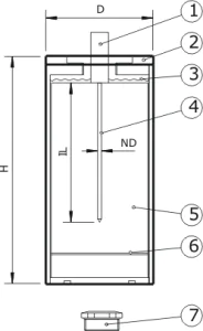 塑料材料結合在金屬保護套(2)中。提供了一種用于密封目的的塞子(7)。為了針(1)和參考材料(5)之間的接觸,金屬外殼填充有流體甘油(3)。提供了額外的孔(6),以便能夠用細針探針進行材料穩定性的檢查。建議用戶每5年將CRC發送給Hukseflux進行一次材料穩定性檢查。