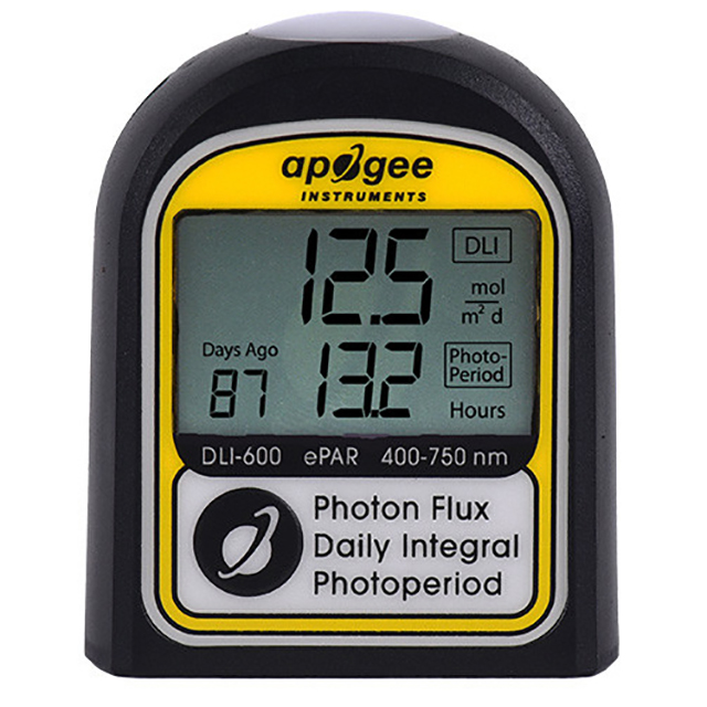 DLI-600 光譜儀 是 2022 年的新產品,是一款優雅、易于使用的設備,用于抽查超出傳統 400–700 nm 范圍的光合有效輻射 (PAR)。DLI-600 測量新定義的 400-750 nm ePAR 輻射范圍,該范圍已被證明具有擴展的光合活性特性。除了測量 ePAR 之外,DLI-600 儀表還計算日光積分 (DLI) 和光周期。ePAR、DLI 和光周期影響植物的生長和發育,通常在溫室和生長室中測量它們以幫助進行光照管理和決策。