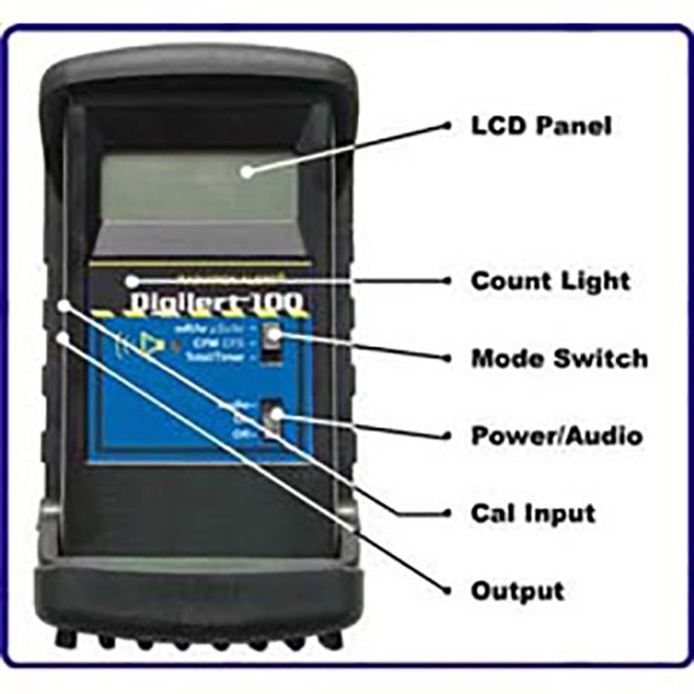 Digilert 100可測量α、β、γ和x射線。它的數字顯示屏顯示您選擇的每分鐘計數(CPM)或mR/hr或累計計數的讀數。當檢測到每個計數以及輻射達到用戶設置的警報級別時,紅色LED閃爍,蜂鳴器響起。