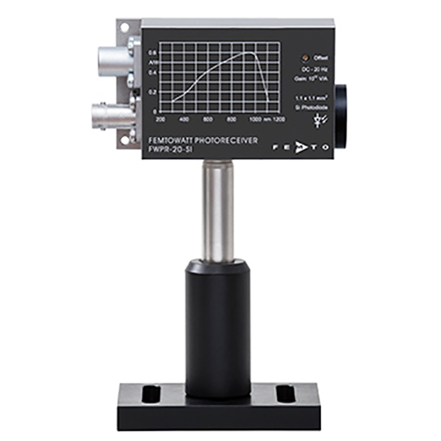 FWPR-20 系列光接收器將低噪聲 Si 或 InGaAs PIN 光電二極管與專門設計的跨阻放大器相結合,具有高達 1012 V/A的高增益和低噪聲。由于其 0.7 fW/√Hz 的極低 NEP,這種獨特的組合產生了具有飛瓦靈敏度的光接收器。可以直接檢測低至約 50 fW 的光功率。結合可選的 FEMTO 鎖相放大器,甚至可以檢測亞飛瓦范圍內的功率水平。