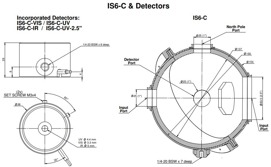 IS6-C-VIS 是一個 6 英寸積分球(內(nèi)部 5.3 英寸),帶有用于準(zhǔn)直 (C) 光束的硅探測器。IS6-C-VIS 帶有 VIS 檢測器,校準(zhǔn)范圍為 400 至 1100nm,可測量高達 30W 的功率。