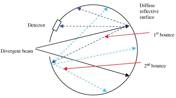 積分球用于測量發散光源。如圖所示,積分球的內表面涂有以散射、非鏡面方式高度反射(通常為 99%)的表面。因此,當發散光束射到積分球壁上時,光線會被反射和散射多次,直到射到球壁上任何地方的光都具有相同的強度。因此,放置在球體中的檢測器獲得與其他任何地方相同的強度,并且檢測器檢測到的功率與與光束發散無關的總入射功率成正比。(檢測器的布置使其只能看到散射光,而看不到入射光束。)理想的積分球具有具有朗伯反射特性的表面。這意味著入射到表面上的光在表面上方 2pi 球面度立體角的所有方向上均勻散射。Ophir 積分球頭中使用的表面非常接近朗伯表面。