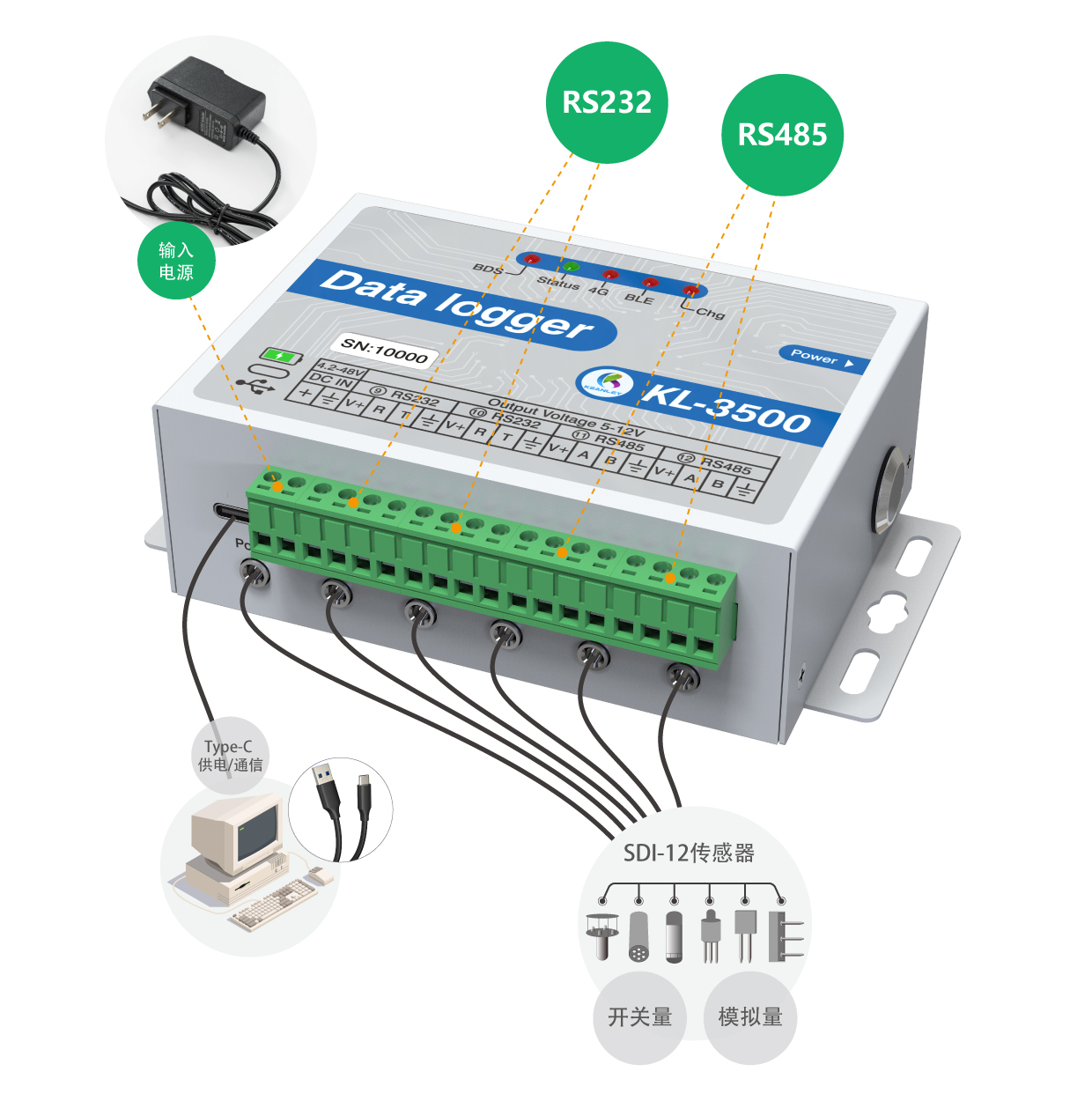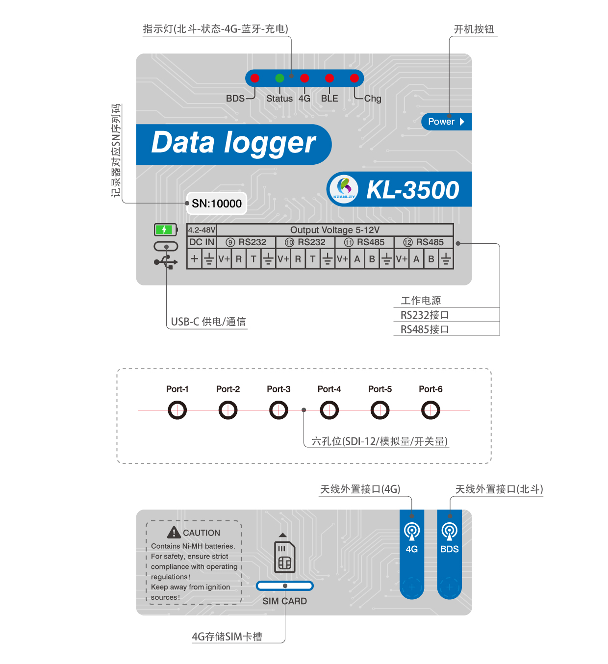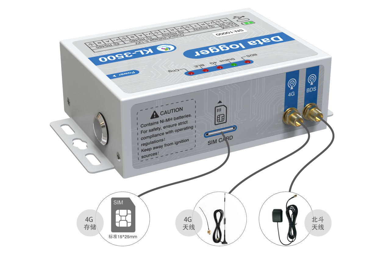 KL-3500專門用于SDI協(xié)議和DDI模式,RS485和RS232以及模擬量和脈沖量的傳感器。數(shù)據(jù)記錄儀有12個(gè)插接口(6個(gè)傳感器接口,2個(gè)帶供電的485,2個(gè)帶供電的232,1個(gè)大氣壓溫度接口,一個(gè)北斗數(shù)據(jù)口)具體參考軟件界面里的接口說明,一個(gè)2P的3.81端子供電口,1個(gè)TYPE-C接口(可供電和通信)1個(gè)電源按鈕,5個(gè)狀態(tài)指示燈(LED1為北斗狀態(tài)指示燈,LED3為運(yùn)行狀態(tài)指示燈,LED2為4G狀態(tài)指示燈,LED4為藍(lán)牙狀態(tài)指示燈,LED5為充電狀態(tài)指示燈),2個(gè)天線接口(4G通信天線,北斗天線),上部是電池倉(cāng)可使用6節(jié)鎳氫電池或堿性電池。