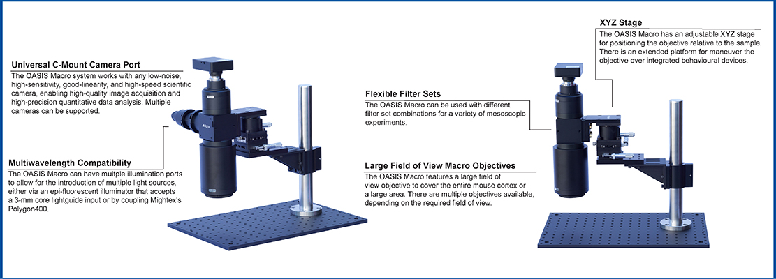 OASIS Macro 旨在對頭部固定小鼠的整個皮層或清醒動物的大皮層區(qū)域的數(shù)千個神經(jīng)元群的活動進行成像。與傳統(tǒng)顯微鏡相比,與OASIS Macro兼容的鏡頭提供了更大的視野。