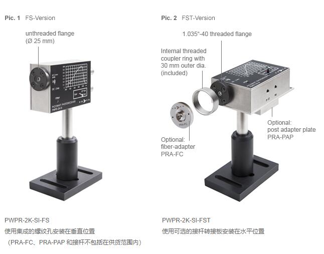 所有 PWPR-2K 光接收器均具有 UNC 8-32 和 M4 螺紋孔,用于安裝在公制和英制螺紋標準柱上。可選的轉接板 PRA-PAP 開辟了更多的安裝選項。