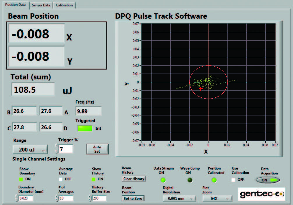 QUAD-4Track 包含功能強大的單機軟件 LabView,用于控制儀表、處理數(shù)據(jù)并顯示 X 軸和 Y 軸位置。該軟件還可顯示脈沖源的能量或功率以及重復率。本界面中的大型圖表顯示線束的矩心位置并實時追蹤其移動。該關鍵包含許多實用功能,例如:設置邊界、放大(2 倍至 128 倍)、設置分辨率、數(shù)據(jù)記錄等,不一而足。綠線代表追蹤歷史。