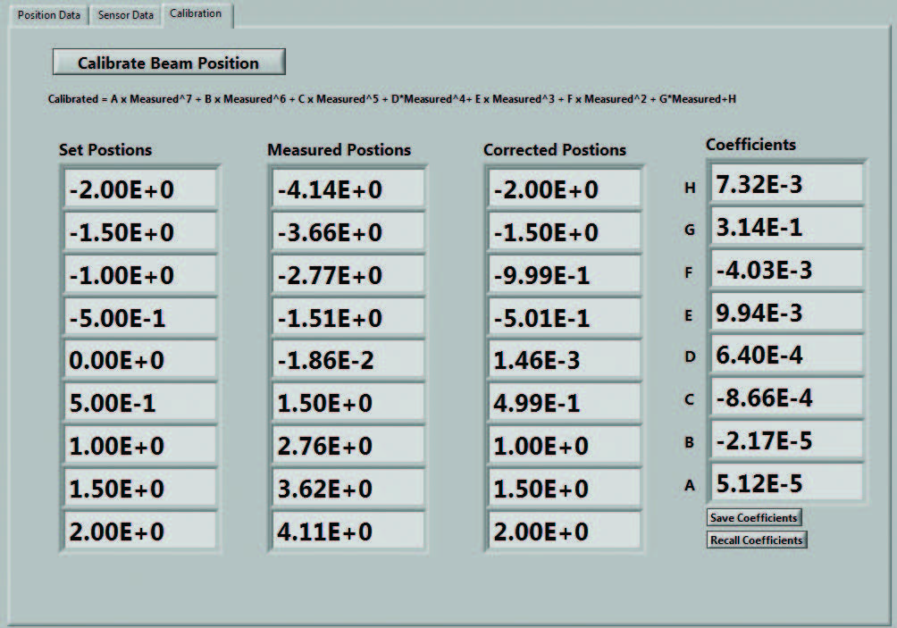 這需要使用微米級線性階段(只有 1 根軸)。如左側(cè)的校準界面所示,該程序包括儀表調(diào)零,移動 QUAD 探測器至九個分立位置(+2000 mm 至 -2000 mm)并采集 QUAD 讀數(shù)。然后,該程序會確定校正系數(shù)(最后一欄)并將其運用到原始數(shù)據(jù)以到達“校正位置”。現(xiàn)在,QUAD 探測器已校準完畢!