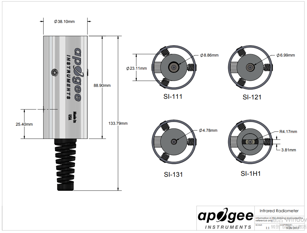 SI-411具有SDI-12數字輸出和高質量電纜,端接在預鍍錫尾纖引線中,便于連接到數據記錄器和控制器。該傳感器具有22°半角度視場,響應時間為0.1秒。為了更好地安裝,已經更新了遮陽板設計(有關更多信息,請參閱產品圖片)。典型的應用包括用于植物水分狀況估計的植物冠層溫度測量、用于確定結冰條件的路面溫度測量以及用于能量平衡研究的地表(土壤、植被、水、雪)溫度測量。傳感器包括IP68 不銹鋼電纜連接器,距離頭部30厘米,以簡化傳感器的拆卸和更換,便于維護和重新校準。SI-411-SS設計用于安裝遠地點AM-250商用安裝支架。