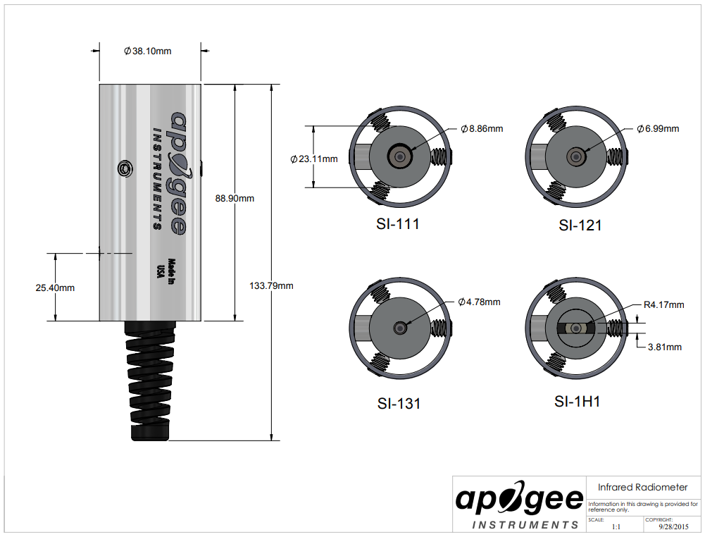 SIF-1H1-SS是一種響應時間為0.2秒的快速響應模型紅外輻射計。模擬傳感器未經放大,具有電壓輸出和高質量電纜,端接在預鍍錫尾纖導線中,便于連接到數據記錄器和控制器。傳感器獨特的幾何形狀在水平方向上提供了32°的寬半角度視場,在垂直方向上提供13°的半角度視場。這使得用戶能夠以較淺的角度安裝傳感器,而不會看到地平線上方,同時盡可能擴大測量的面積。典型的應用包括用于植物水分狀況估計的植物冠層溫度測量、表型、表型、用于確定結冰條件的路面溫度測量,以及用于能量平衡研究的地表(土壤、植被、水、雪)溫度測量。傳感器包括IP68不銹鋼電纜連接器,距離頭部30厘米,以簡化傳感器的拆卸和更換,便于維護和重新校準。SIF-1H1-SS設計用于安裝遠地點AM-250商用安裝支架。