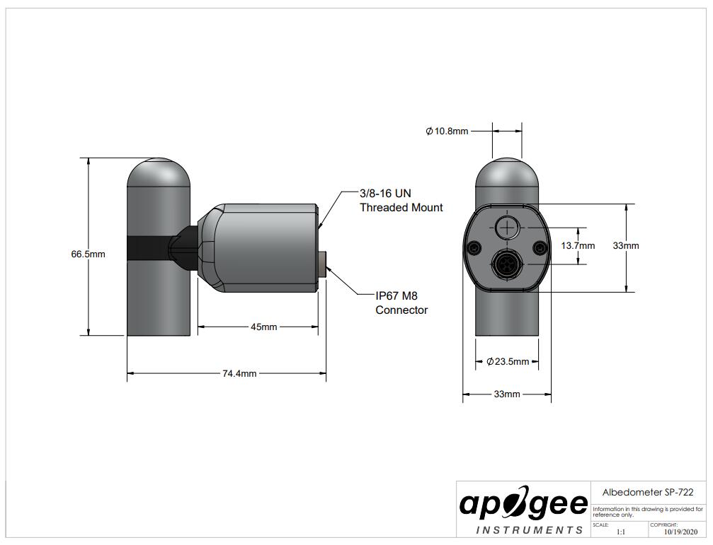 SP-722 是一款熱電堆反照率計,使用 Modbus RTU 協議通過 RS-232 或 RS-485 發送數字信號。要直接安裝到太陽能電池板上,我們建議使用AM-150反照率計太陽能電池板夾緊支架。要安裝到桅桿上,請使用AM-500凈輻射計安裝支架或基于AM-240桿的安裝夾具。