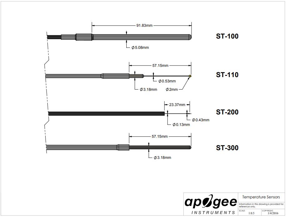 ST-150 是一款 1/8 英寸的 A 級 PRT(鉑電阻溫度計),防護等級為 IP67。PRT 后面的電纜上使用了白色熱縮管,以很大限度地減少傳到傳感器的熱量。PRT 護套尺寸直徑為 3 毫米長度為 65 毫米。