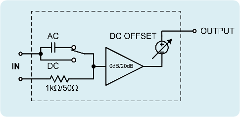 圖1顯示了TS250波形放大器的功能等效圖。它由交流耦合或直流耦合輸入、可選輸入阻抗(高阻抗或 50Ω)、可選增益級(0dB 或 20dB)、高電流放大器和直流輸出偏移組成。可調節的直流偏置設置輸出直流電壓。此直流偏移功能非常適合 LDO 或放大器 PSRR 測量,因為它們需要直流電壓。