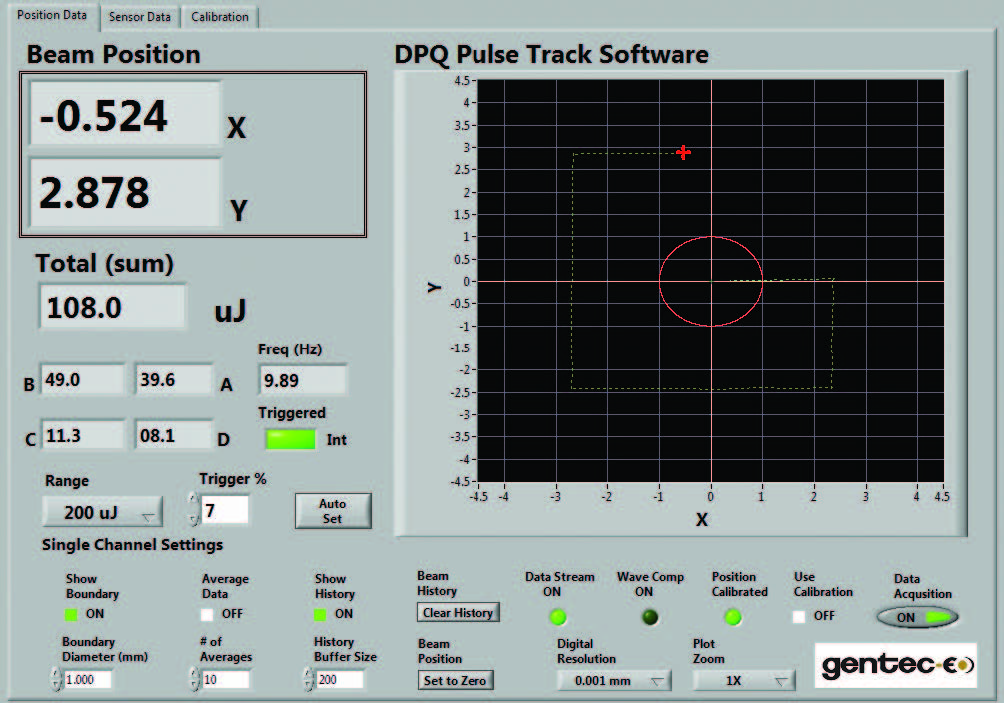 QUAD-4Track 包含功能強大的單機軟件 LabView,用于控制儀表、處理數據并顯示 X 軸和 Y 軸位置。該軟件還可顯示脈沖源的能量或功率以及重復率。本界面中的大型圖表顯示線束的矩心位置并實時追蹤其移動。該關鍵包含許多實用功能,例如:設置邊界、放大(2 倍至 128 倍)、設置分辨率、數據記錄等,不一而足。綠線代表追蹤歷史。