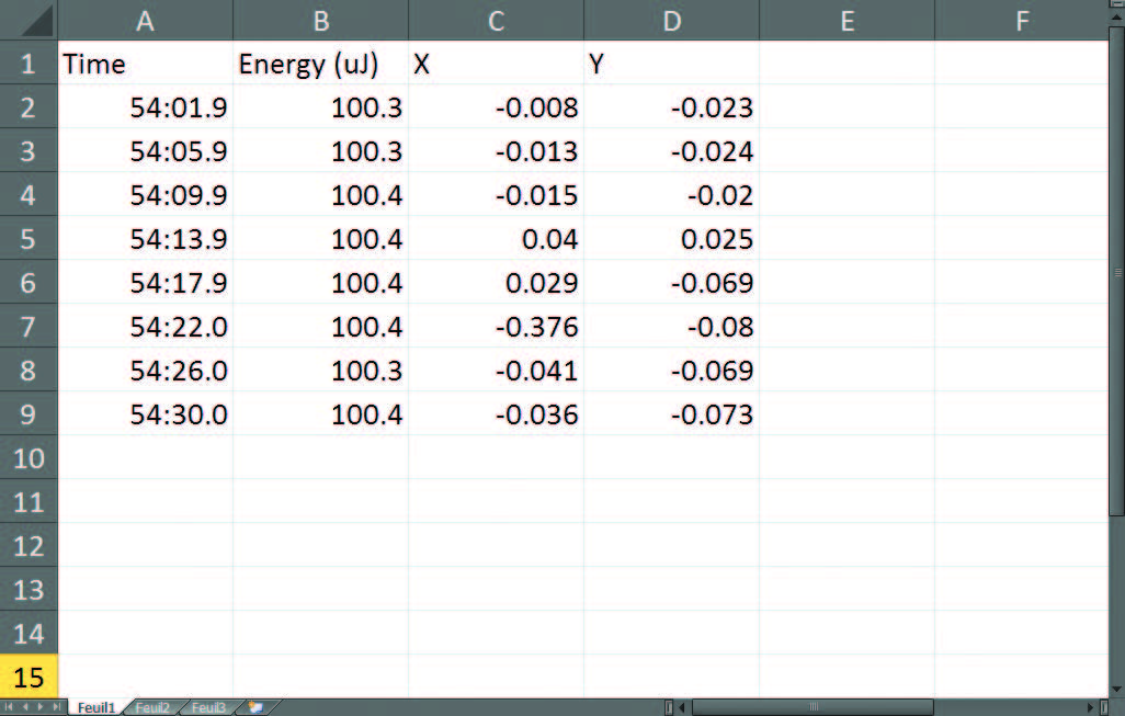 另一個非常實用的功能是“數據記錄”。通過這一功能,您可以設置 QUAD-4Track 以跟進激光在過去數分鐘、數小時甚至數天內的位移、能量和/或功率。需要在激光器熱機時測量激光的“光束偏轉”嗎?使用數據記錄就行了!需要測量不同激光重復率或能量級對應的光束位移嗎?數據記錄可以幫您測量!