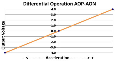 The Model 1531 produces a differential ±4 volts output voltage, the value of which varies with acceleration as shown in the figure. The seismic center is located on a centerline through the dual sense elements halfway between them. Any errors due to rotation about this point are effectively cancelled by the internal electronics.