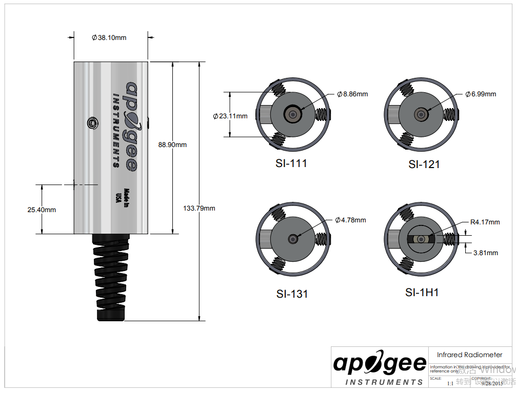The SIF-121 is a fast response model infrared radiometer with a 0.2 second response time. The analog sensor is un-amplified and has a voltage output and high-quality cable terminating in pre-tinned pigtail leads for easy connection to dataloggers and controllers. The sensor has a 18° half-angle field of view. Typical applications include plant canopy temperature measurement for use in plant water status estimation, phenotyping, phenomics, road surface temperature measurement of determination of icing conditions, and terrestrial surface (soil, vegetation, water, snow) temperature measurement in energy balance studies. Sensor includes IP68 marine-grade stainless-steel cable connector 30 cm from head to simplify sensor removal and replacement for maintenance and recalibration. The SIF-121 is designed to be mounted with an Apogee AM-250 commercial-grade mounting bracket.